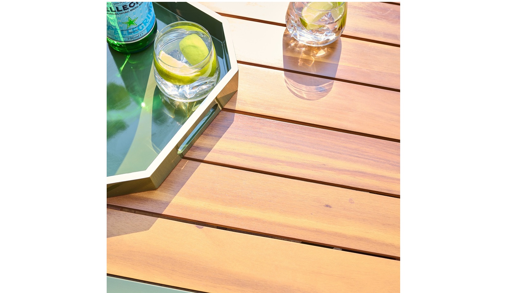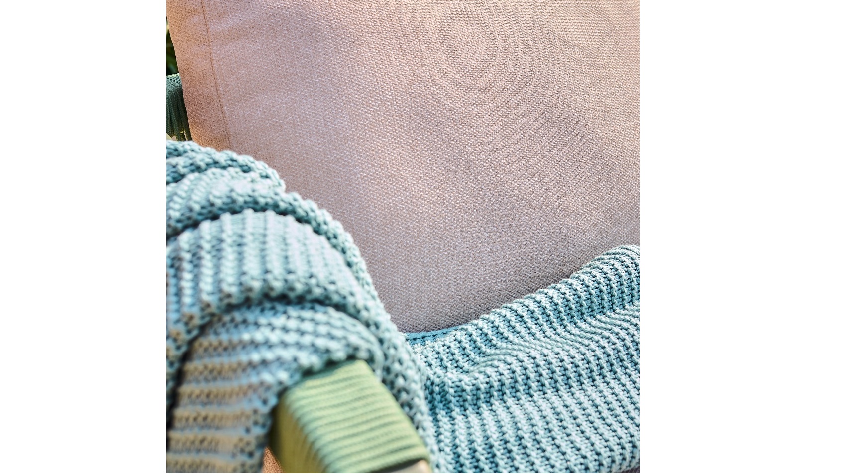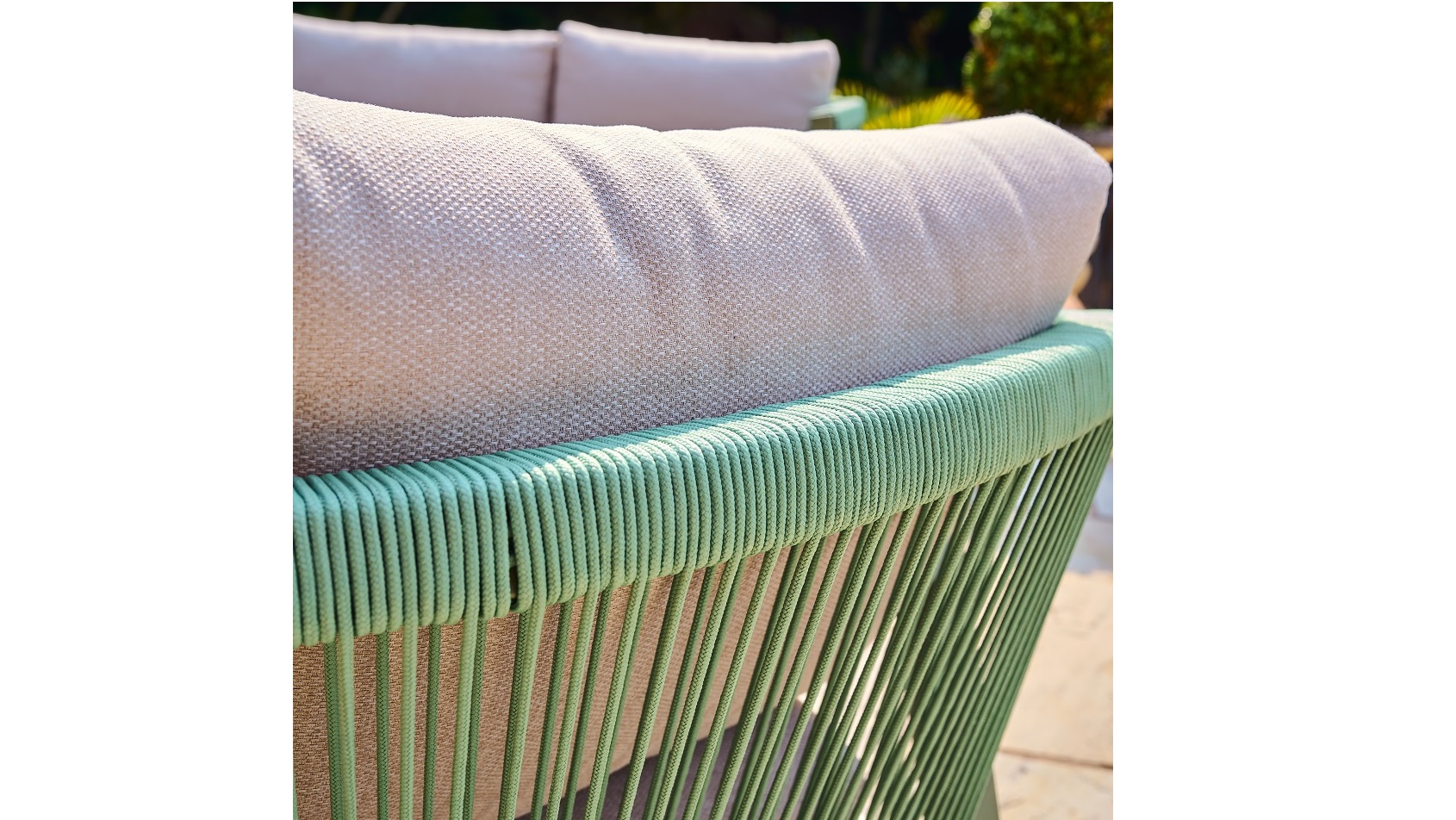 The olive green powder-coated aluminium frames are rust-resistant and built to last, while the backs of the sofa and chairs feature woven rope detailing for added texture and visual interest. Soft 230gsm polyester cushions provide lasting comfort, and the coffee table is topped with responsibly sourced timber for a warm, natural finish.